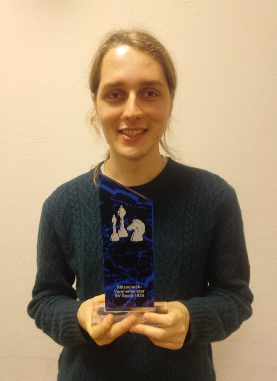 Zehn Teilnehmer kämpften am Freitagabend um den Titel des Vereinsmeisters im Blitzschach; bei einer Bedenkzeit von 3 Minuten pro Spieler und Partie zuzüglich 2 Sekunden Bonus pro Zug waren vor allem Schnelligkeit, Konzentration und Übersicht gefragt. Hauke Schiemann stellte in den neun Runden unter Beweis, dass er diese Eigenschaften besitzt, und konnte zum mittlerweile zweiten Mal den Titel gewinnen (s. Foto unten). Er unterlag zwar gegen Silas Schlüter, gewann aber gegen alle anderen und lag mit 8 Punkten klar an der Spitze. Punktgleich auf dem zweiten Platz landeten Klaus Vatter und Viktor Dongash (je 6,5) vor Hendrik Hündlings (6), Richard Müller (5,5), Simon Schröder (5), Silas Schlüter (4,5), Rauf Seyid (2), Alexander Walter (1) und Lukas Kuithan.